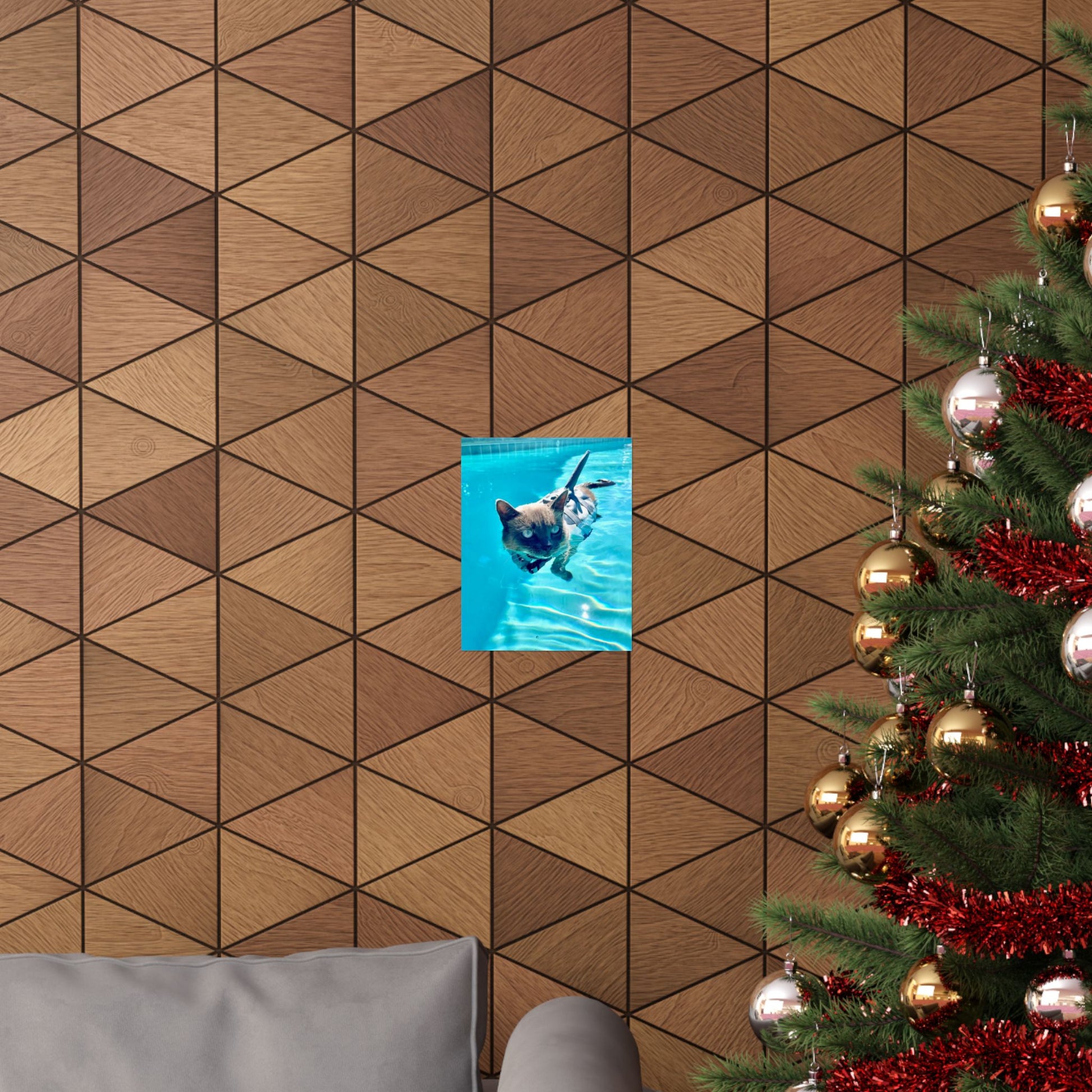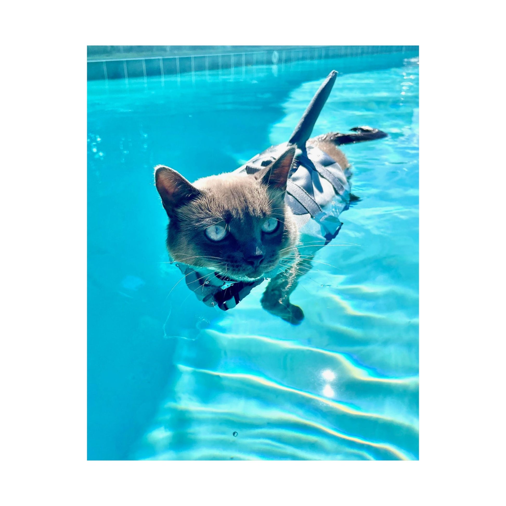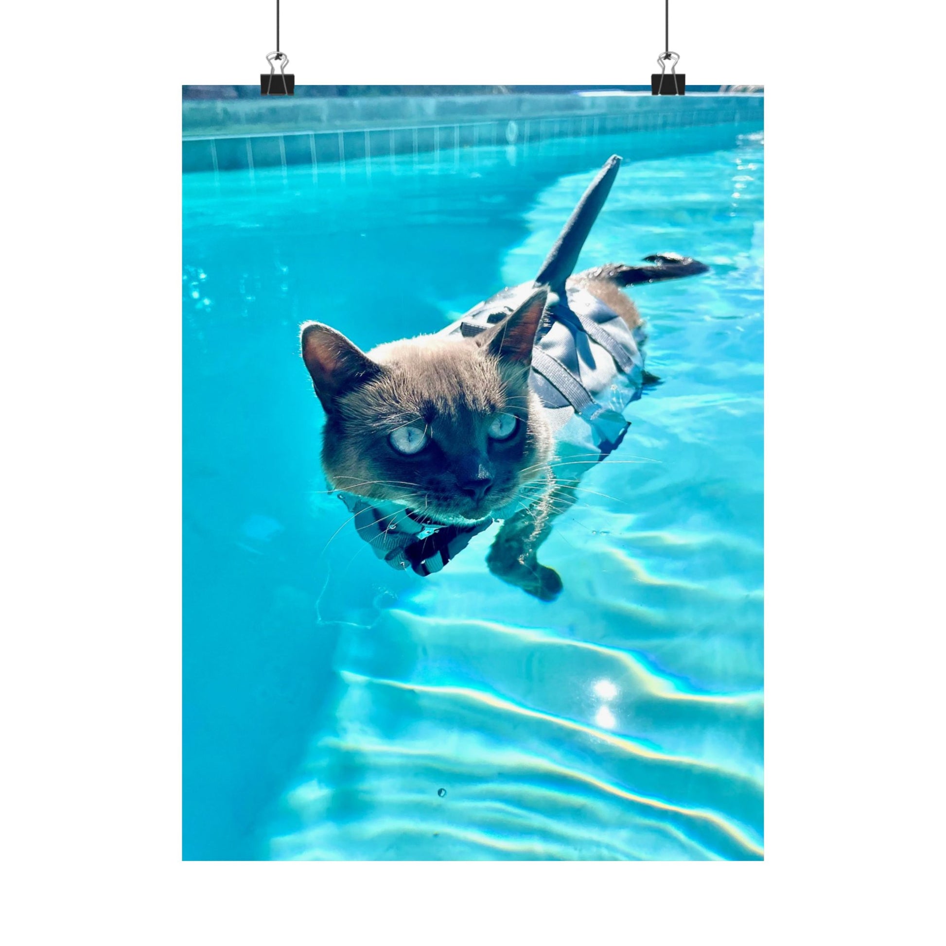 A vibrant matte poster that captures a playful Sharkitty moment, paddling through crystalline pool water, eyes bright and fur outlined by sunlit ripples. Printed with museum-grade archival paper and high-fidelity giclée inks, the image holds rich, saturated blues and crisp detail without glossy glare. Hung in a hallway, studio, or living room, it brings a breezy, whimsical energy and a touch of everyday wonder to indoor walls. Please select desired size.