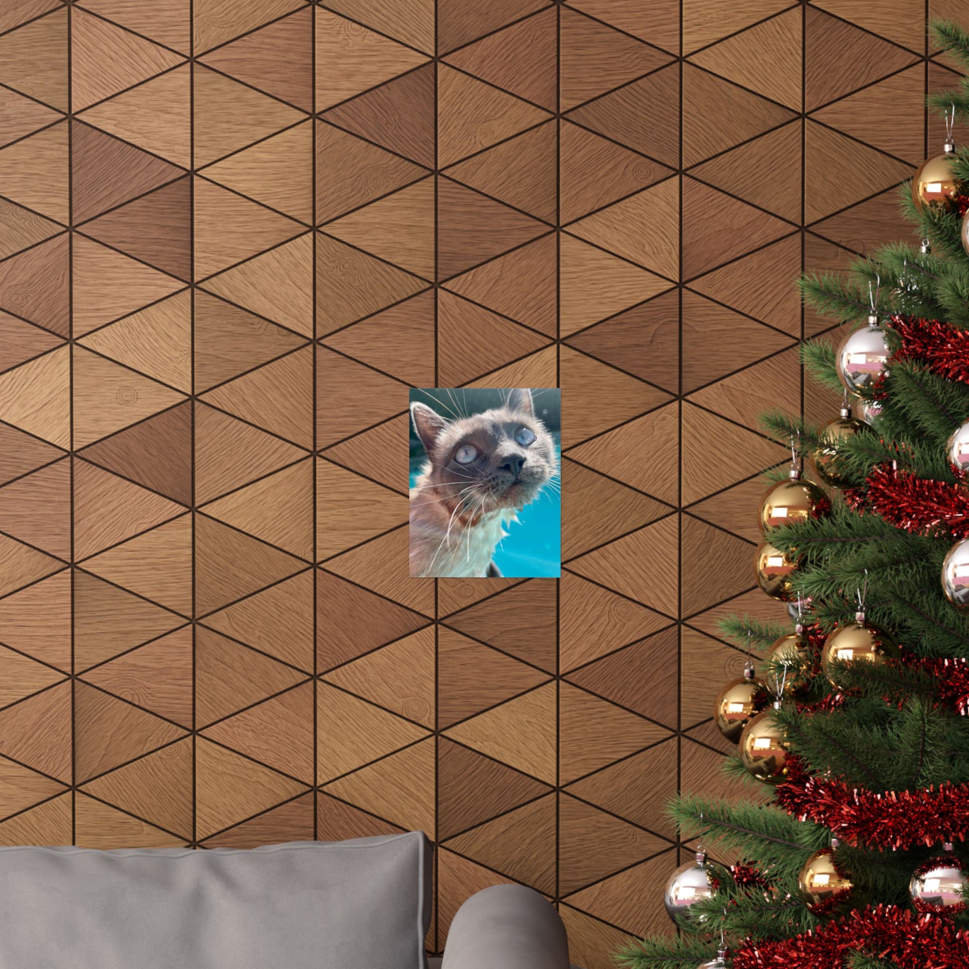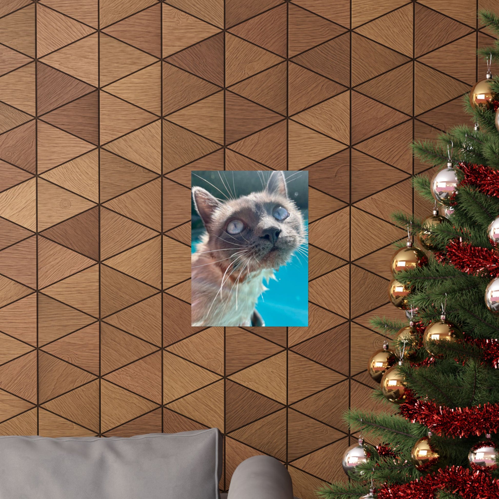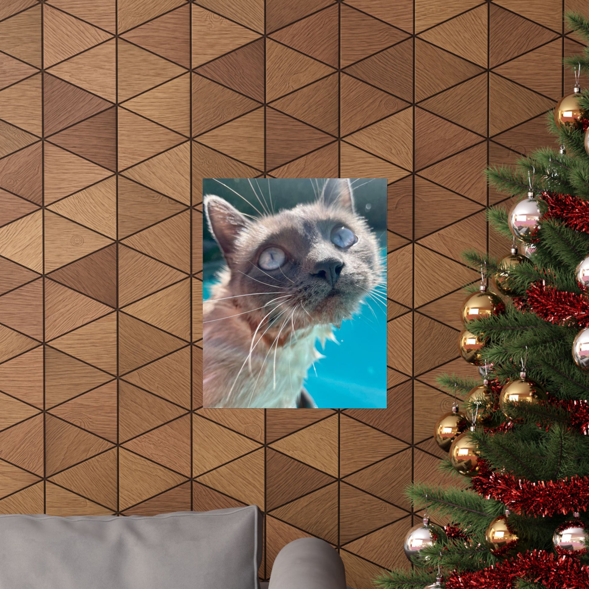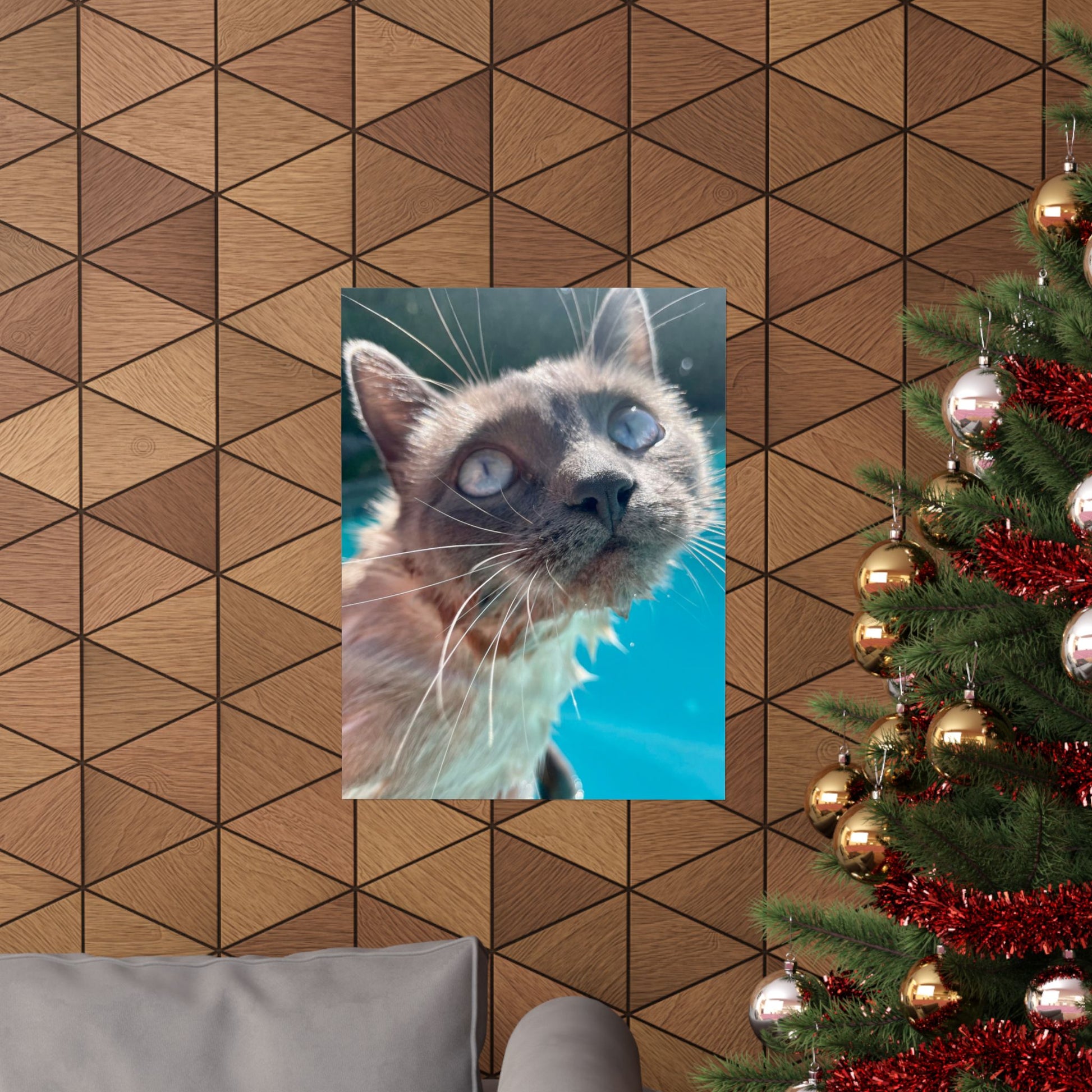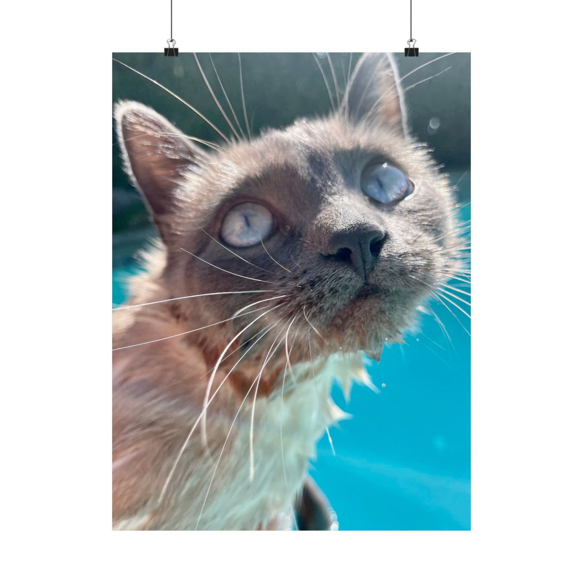 This matte vertical poster captures a close, soulful portrait of Hester with luminous eyes against a vibrant teal pool background's . Printed using museum-grade archival paper and giclée techniques, colors stay rich and true while the matte finish reduces glare and gives the image a soft, gallery-ready presence. The composition invites quiet moments—place it above a reading nook, in a sunlit hallway (out of direct weather exposure), or on a studio wall where the playful, curious gaze can brighten the room and spark conversation.